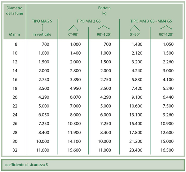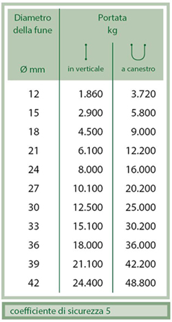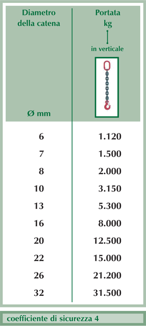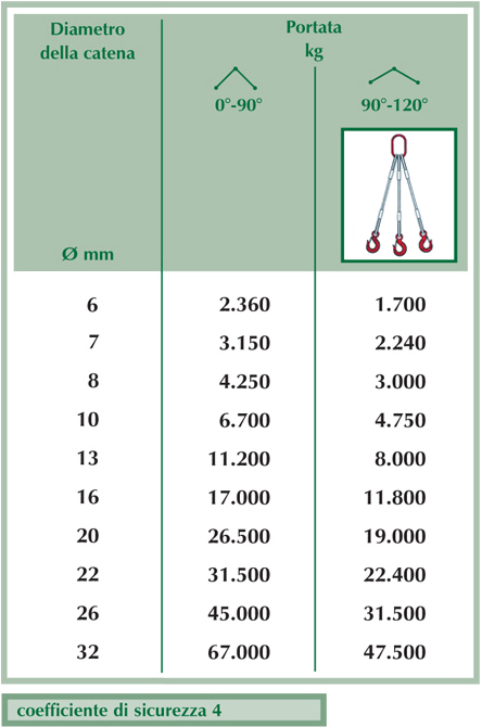 Il coefficiente di sicurezza per le catene di sollevamento ed i suoi accessori è 4.