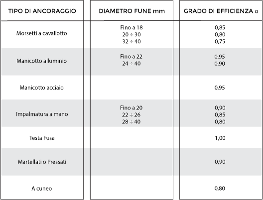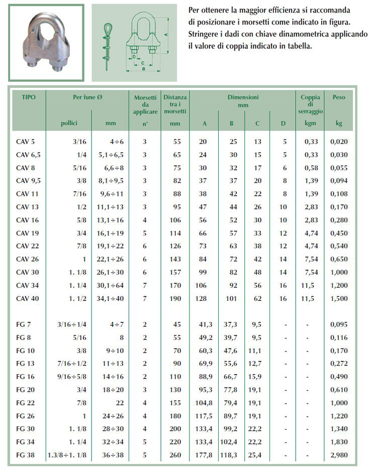 ASOLA Può essere protetta o meno da una redancia e può essere formata con: – morsetti: 1. Per ottenere la maggiore efficienza si raccomanda di posizionare i morsetti come indicato in figura. 2. Montare i morsetti in maniera errata può comportare la diminuzione dell’efficienza del 60% rispetto al carico di rottura della fune 3. Utilizzare il numero di morsetti previsti nella relativa tabella 4. Montare i morsetti alla distanza prevista nella relativa tabella con la chiave dinamometrica 5. Verificare la corretta chiusura dopo qualche impiego. E’ sconsigliato se la fune è soggetta a vibrazioni. – Manicotto di alluminio: l’asola è fissata con un manicotto pressato. E’ sconsigliato in presenza di elevate temperature. – Impalmatura a mano: vengono intrecciati a mano i trefoli garantendone la portata.